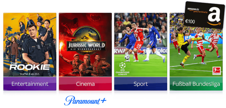 | Inhalte | 4 Pakete (Sky Bundesliga, Sky Cinema, Sky Sport, Sky Entertainment Plus) inkl. Netflix & Paramount+! |